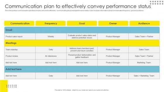 This slide portrays communication plan that company will use for effectively communicating the product performance status. It also includes information about communication frequency, goal and audience. Present like a pro with Communication Plan To Effectively Strategic Brand Management Formats Pdf Create beautiful presentations together with your team, using our easy to use presentation slides. Share your ideas in real time and make changes on the fly by downloading our templates. So whether you are in the office, on the go, or in a remote location, you can stay in sync with your team and present your ideas with confidence. With Slidegeeks presentation got a whole lot easier. Grab these presentations today. This slide portrays communication plan that company will use for effectively communicating the product performance status. It also includes information about communication frequency, goal and audience.