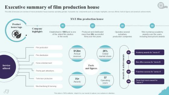 This slide showcases an overview of movie production house business operating globally. It presents key components such as company highlights, services offered, facts and figures and awards and achievements. Do you have an important presentation coming up Are you looking for something that will make your presentation stand out from the rest Look no further than Executive Summary Of Film Production House Strategic Plan To Increase Film Ppt Slides Strategy SS V. With our professional designs, you can trust that your presentation will pop and make delivering it a smooth process. And with Slidegeeks, you can trust that your presentation will be unique and memorable. So why wait Grab Executive Summary Of Film Production House Strategic Plan To Increase Film Ppt Slides Strategy SS V today and make your presentation stand out from the rest This slide showcases an overview of movie production house business operating globally. It presents key components such as company highlights, services offered, facts and figures and awards and achievements.