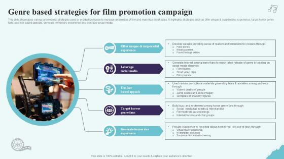 This slide showcases various promotional strategies used by production house to increase awareness of film and maximize ticket sales. It highlights strategies such as offer unique and suspenseful experience, target horror genre fans, use fear based appeals, generate immersive experience and leverage social media. Coming up with a presentation necessitates that the majority of the effort goes into the content and the message you intend to convey. The visuals of a PowerPoint presentation can only be effective if it supplements and supports the story that is being told. Keeping this in mind our experts created Genre Based Strategies For Strategic Plan To Increase Film Ppt Presentation Strategy SS V to reduce the time that goes into designing the presentation. This way, you can concentrate on the message while our designers take care of providing you with the right template for the situation. This slide showcases various promotional strategies used by production house to increase awareness of film and maximize ticket sales. It highlights strategies such as offer unique and suspenseful experience, target horror genre fans, use fear based appeals, generate immersive experience and leverage social media.