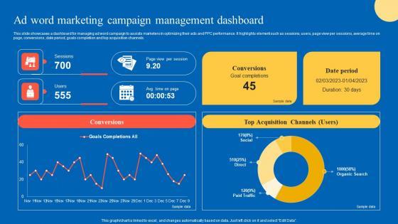 This slide showcases a dashboard for managing ad word campaign to assists marketers in optimizing their ads and PPC performance. It highlights element such as sessions, users, page view per sessions, average time on page, conversions, date period, goals completion and top acquisition channels. Create an editable Ad Word Marketing Strategic Guide For Marketing Program Icons Pdf that communicates your idea and engages your audience. Whether you are presenting a business or an educational presentation, pre designed presentation templates help save time. Ad Word Marketing Strategic Guide For Marketing Program Icons Pdf is highly customizable and very easy to edit, covering many different styles from creative to business presentations. Slidegeeks has creative team members who have crafted amazing templates. So, go and get them without any delay. This slide showcases a dashboard for managing ad word campaign to assists marketers in optimizing their ads and PPC performance. It highlights element such as sessions, users, page view per sessions, average time on page, conversions, date period, goals completion and top acquisition channels.