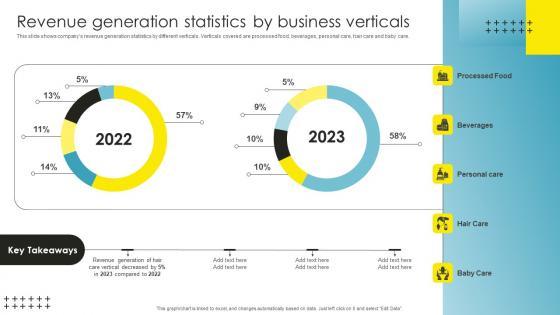 This slide shows companys revenue generation statistics by different verticals. Verticals covered are processed food, beverages, personal care, hair care and baby care. Coming up with a presentation necessitates that the majority of the effort goes into the content and the message you intend to convey. The visuals of a PowerPoint presentation can only be effective if it supplements and supports the story that is being told. Keeping this in mind our experts created Revenue Generation Statistics Strategic Brand Management Background Pdf to reduce the time that goes into designing the presentation. This way, you can concentrate on the message while our designers take care of providing you with the right template for the situation. This slide shows companys revenue generation statistics by different verticals. Verticals covered are processed food, beverages, personal care, hair care and baby care.