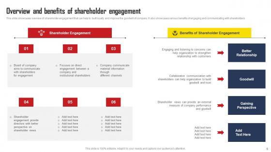 This slide showcases overview of shareholder engagement that can help to built loyalty and improve the goodwill of company. It also showcases various benefits of engaging and communicating with shareholders. If your project calls for a presentation, then Slidegeeks is your go-to partner because we have professionally designed, easy-to-edit templates that are perfect for any presentation. After downloading, you can easily edit Overview And Benefits Of Shareholder Engagement Comprehensive Strategic Plan Elements Pdf and make the changes accordingly. You can rearrange slides or fill them with different images. Check out all the handy templates This slide showcases overview of shareholder engagement that can help to built loyalty and improve the goodwill of company. It also showcases various benefits of engaging and communicating with shareholders.