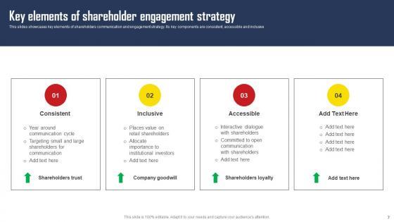 This slides showcases key elements of shareholders communication and engagement strategy. Its key components are consistent, accessible and inclusive. Find highly impressive Key Elements Of Shareholder Engagement Strategy Comprehensive Strategic Plan Demonstration Pdf on Slidegeeks to deliver a meaningful presentation. You can save an ample amount of time using these presentation templates. No need to worry to prepare everything from scratch because Slidegeeks experts have already done a huge research and work for you. You need to download Key Elements Of Shareholder Engagement Strategy Comprehensive Strategic Plan Demonstration Pdf for your upcoming presentation. All the presentation templates are 100 percent editable and you can change the color and personalize the content accordingly. Download now. This slides showcases key elements of shareholders communication and engagement strategy. Its key components are consistent, accessible and inclusive.