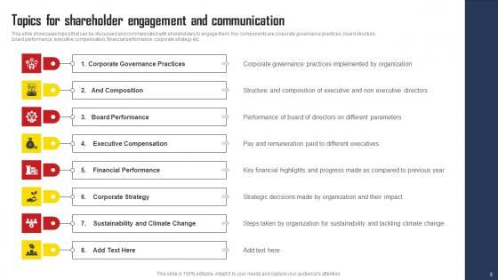This slide showcases topics that can be discussed and communicated with shareholders to engage them. Key components are corporate governance practices, board structure, board performance, executive compensation, financial performance, corporate strategy etc. Here you can discover an assortment of the finest PowerPoint and Google Slides templates. With these templates, you can create presentations for a variety of purposes while simultaneously providing your audience with an eye-catching visual experience. Download Topics For Shareholder Engagement And Communication Comprehensive Strategic Plan Background Pdf to deliver an impeccable presentation. These templates will make your job of preparing presentations much quicker, yet still, maintain a high level of quality. Slidegeeks has experienced researchers who prepare these templates and write high-quality content for you. Later on, you can personalize the content by editing the Topics For Shareholder Engagement And Communication Comprehensive Strategic Plan Background Pdf This slide showcases topics that can be discussed and communicated with shareholders to engage them. Key components are corporate governance practices, board structure, board performance, executive compensation, financial performance, corporate strategy etc.