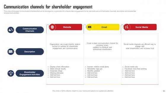 This slide showcases communication channels that can be leveraged by organization for shareholders engagement. Its key elements are communication channels, description and shareholder engagement activities. Create an editable Communication Channels For Shareholder Engagement Comprehensive Strategic Plan Formats Pdf that communicates your idea and engages your audience. Whether you are presenting a business or an educational presentation, pre-designed presentation templates help save time. Communication Channels For Shareholder Engagement Comprehensive Strategic Plan Formats Pdf is highly customizable and very easy to edit, covering many different styles from creative to business presentations. Slidegeeks has creative team members who have crafted amazing templates. So, go and get them without any delay. This slide showcases communication channels that can be leveraged by organization for shareholders engagement. Its key elements are communication channels, description and shareholder engagement activities.