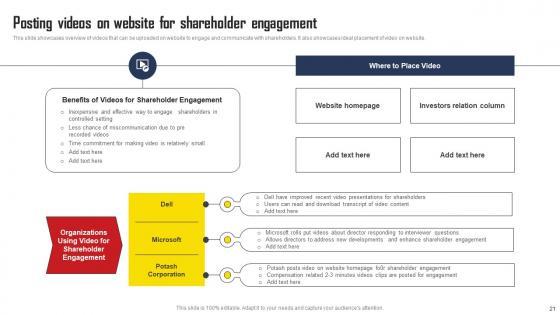 This slide showcases overview of videos that can be uploaded on website to engage and communicate with shareholders. It also showcases ideal placement of video on website. Coming up with a presentation necessitates that the majority of the effort goes into the content and the message you intend to convey. The visuals of a PowerPoint presentation can only be effective if it supplements and supports the story that is being told. Keeping this in mind our experts created Posting Videos On Website For Shareholder Engagement Comprehensive Strategic Plan Microsoft Pdf to reduce the time that goes into designing the presentation. This way, you can concentrate on the message while our designers take care of providing you with the right template for the situation. This slide showcases overview of videos that can be uploaded on website to engage and communicate with shareholders. It also showcases ideal placement of video on website.