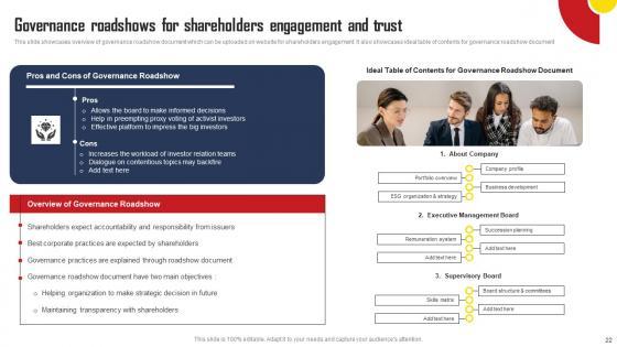 This slide showcases overview of governance roadshow document which can be uploaded on website for shareholders engagement. It also showcases ideal table of contents for governance roadshow document. Do you have an important presentation coming up Are you looking for something that will make your presentation stand out from the rest Look no further than Governance Roadshows For Shareholders Engagement Comprehensive Strategic Plan Introduction Pdf With our professional designs, you can trust that your presentation will pop and make delivering it a smooth process. And with Slidegeeks, you can trust that your presentation will be unique and memorable. So why wait Grab Governance Roadshows For Shareholders Engagement Comprehensive Strategic Plan Introduction Pdf today and make your presentation stand out from the rest. This slide showcases overview of governance roadshow document which can be uploaded on website for shareholders engagement. It also showcases ideal table of contents for governance roadshow document.