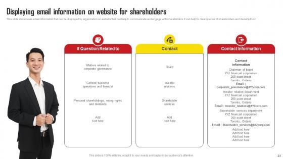 This slide showcases email information that can be displayed by organization on website that can help to communicate and engage with shareholders. It can help to clear queries of shareholders and develop trust. Do you have to make sure that everyone on your team knows about any specific topic I yes, then you should give Displaying Email Information On Website For Shareholders Comprehensive Strategic Plan Download Pdf a try. Our experts have put a lot of knowledge and effort into creating this impeccable Displaying Email Information On Website For Shareholders Comprehensive Strategic Plan Download Pdf You can use this template for your upcoming presentations, as the slides are perfect to represent even the tiniest detail. You can download these templates from the Slidegeeks website and these are easy to edit. So grab these today. This slide showcases email information that can be displayed by organization on website that can help to communicate and engage with shareholders. It can help to clear queries of shareholders and develop trust.