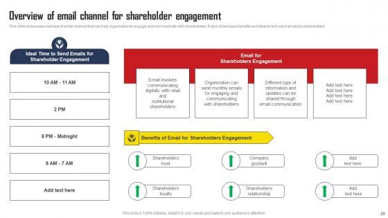 This slide showcases overview of email channel that can help organization to engage and communicate with shareholders. It also showcases benefits and ideal time to send emails to shareholders. If you are looking for a format to display your unique thoughts, then the professionally designed Overview Of Email Channel For Shareholder Engagement Comprehensive Strategic Plan Microsoft Pdf is the one for you. You can use it as a Google Slides template or a PowerPoint template. Incorporate impressive visuals, symbols, images, and other charts. Modify or reorganize the text boxes as you desire. Experiment with shade schemes and font pairings. Alter, share or cooperate with other people on your work. Download Overview Of Email Channel For Shareholder Engagement Comprehensive Strategic Plan Microsoft Pdf and find out how to give a successful presentation. Present a perfect display to your team and make your presentation unforgettable. This slide showcases overview of email channel that can help organization to engage and communicate with shareholders. It also showcases benefits and ideal time to send emails to shareholders.