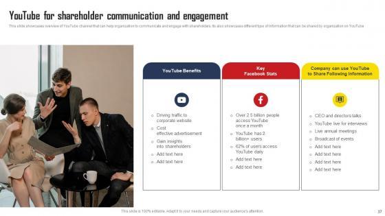 This slide showcases overview of YouTube channel that can help organization to communicate and engage with shareholders. Its also showcases different type of information that can be shared by organization on YouTube. Do you know about Slidesgeeks Youtube For Shareholder Communication And Engagement Comprehensive Strategic Plan Designs Pdf These are perfect for delivering any kind od presentation. Using it, create PowerPoint presentations that communicate your ideas and engage audiences. Save time and effort by using our pre-designed presentation templates that are perfect for a wide range of topic. Our vast selection of designs covers a range of styles, from creative to business, and are all highly customizable and easy to edit. Download as a PowerPoint template or use them as Google Slides themes. This slide showcases overview of YouTube channel that can help organization to communicate and engage with shareholders. Its also showcases different type of information that can be shared by organization on YouTube.