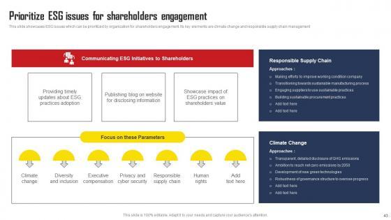This slide showcases ESG issues which can be prioritized by organization for shareholders engagement. Its key elements are climate change and responsible supply chain management. This Prioritize ESG Issues For Shareholders Engagement Comprehensive Strategic Plan Topics Pdf is perfect for any presentation, be it in front of clients or colleagues. It is a versatile and stylish solution for organizing your meetings. The Prioritize ESG Issues For Shareholders Engagement Comprehensive Strategic Plan Topics Pdf features a modern design for your presentation meetings. The adjustable and customizable slides provide unlimited possibilities for acing up your presentation. Slidegeeks has done all the homework before launching the product for you. So, do not wait, grab the presentation templates today This slide showcases ESG issues which can be prioritized by organization for shareholders engagement. Its key elements are climate change and responsible supply chain management.
