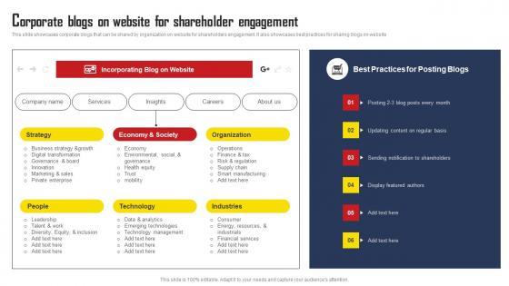 This slide showcases corporate blogs that can be shared by organization on website for shareholders engagement. It also showcases best practices for sharing blogs on website. There are so many reasons you need a Corporate Blogs On Website For Shareholder Engagement Comprehensive Strategic Plan Background Pdf The first reason is you can not spend time making everything from scratch, Thus, Slidegeeks has made presentation templates for you too. You can easily download these templates from our website easily. This slide showcases corporate blogs that can be shared by organization on website for shareholders engagement. It also showcases best practices for sharing blogs on website.