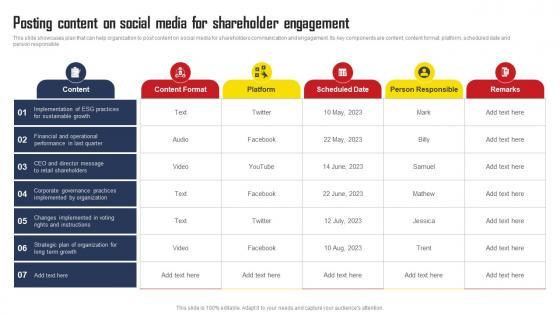 This slide showcases plan that can help organization to post content on social media for shareholders communication and engagement. Its key components are content, content format, platform, scheduled date and person responsible. Make sure to capture your audiences attention in your business displays with our gratis customizable Posting Content On Social Media For Shareholder Engagement Comprehensive Strategic Plan Pictures Pdf These are great for business strategies, office conferences, capital raising or task suggestions. If you desire to acquire more customers for your tech business and ensure they stay satisfied, create your own sales presentation with these plain slides. This slide showcases plan that can help organization to post content on social media for shareholders communication and engagement. Its key components are content, content format, platform, scheduled date and person responsible.