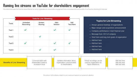 This slide showcases YouTube live stream that can be run by organization for shareholders engagement. It also showcases tools and benefits of YouTube live streaming for corporate. Explore a selection of the finest Running Live Streams On Youtube For Shareholders Comprehensive Strategic Plan Pictures Pdf here. With a plethora of professionally designed and pre-made slide templates, you can quickly and easily find the right one for your upcoming presentation. You can use our Running Live Streams On Youtube For Shareholders Comprehensive Strategic Plan Pictures Pdf to effectively convey your message to a wider audience. Slidegeeks has done a lot of research before preparing these presentation templates. The content can be personalized and the slides are highly editable. Grab templates today from Slidegeeks. This slide showcases YouTube live stream that can be run by organization for shareholders engagement. It also showcases tools and benefits of YouTube live streaming for corporate.