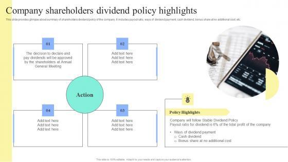 This slide provides glimpse about summary of shareholders dividend policy of the company. It includes payout ratio, ways of dividend payment, cash dividend, bonus share at no additional cost, etc. If you are looking for a format to display your unique thoughts, then the professionally designed Strategic Financial Planning And Administration Company Shareholders Dividend Policy Highlights Guidelines PDF is the one for you. You can use it as a Google Slides template or a PowerPoint template. Incorporate impressive visuals, symbols, images, and other charts. Modify or reorganize the text boxes as you desire. Experiment with shade schemes and font pairings. Alter, share or cooperate with other people on your work. Download Strategic Financial Planning And Administration Company Shareholders Dividend Policy Highlights Guidelines PDF and find out how to give a successful presentation. Present a perfect display to your team and make your presentation unforgettable. This slide provides glimpse about summary of shareholders dividend policy of the company. It includes payout ratio, ways of dividend payment, cash dividend, bonus share at no additional cost, etc.