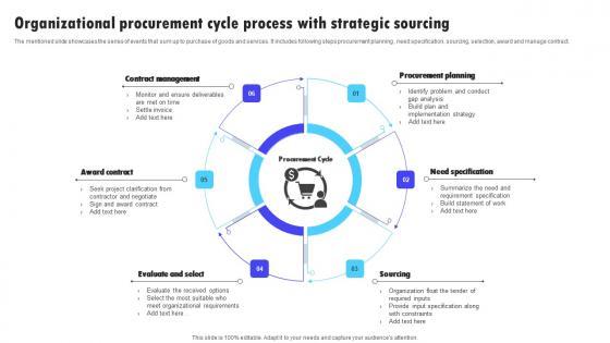 The mentioned slide showcases the series of events that sum up to purchase of goods and services. It includes following steps procurement planning , need specification, sourcing, selection, award and manage contract. Showcasing this set of slides titled Organizational Procurement Cycle Process With Strategic Sourcing Microsoft Pdf. The topics addressed in these templates are Contract Management, Procurement Planning, Need Specification. All the content presented in this PPT design is completely editable. Download it and make adjustments in color, background, font etc. as per your unique business setting. The mentioned slide showcases the series of events that sum up to purchase of goods and services. It includes following steps procurement planning , need specification, sourcing, selection, award and manage contract.