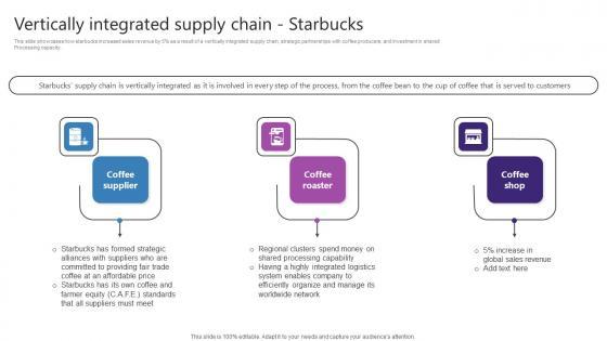This slide showcases how starbucks increased sales revenue by 5 percent as a result of a vertically integrated supply chain, strategic partnerships with coffee producers, and investment in shared Processing capacity. Slidegeeks has constructed Vertically Integrated Supply Chain Starbucks Strategic Plan For Enhancing Summary Pdf after conducting extensive research and examination. These presentation templates are constantly being generated and modified based on user preferences and critiques from editors. Here, you will find the most attractive templates for a range of purposes while taking into account ratings and remarks from users regarding the content. This is an excellent jumping-off point to explore our content and will give new users an insight into our top-notch PowerPoint Templates. This slide showcases how starbucks increased sales revenue by 5 percent as a result of a vertically integrated supply chain, strategic partnerships with coffee producers, and investment in shared Processing capacity.