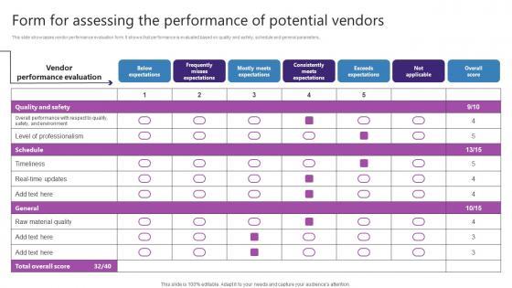 This slide showcases vendor performance evaluation form. It shows that performance is evaluated based on quality and safety, schedule and general parameters. Formulating a presentation can take up a lot of effort and time, so the content and message should always be the primary focus. The visuals of the PowerPoint can enhance the presenters message, so our Form For Assessing The Performance Of Potential Vendors Strategic Plan For Enhancing Portrait Pdf was created to help save time. Instead of worrying about the design, the presenter can concentrate on the message while our designers work on creating the ideal templates for whatever situation is needed. Slidegeeks has experts for everything from amazing designs to valuable content, we have put everything into Form For Assessing The Performance Of Potential Vendors Strategic Plan For Enhancing Portrait Pdf This slide showcases vendor performance evaluation form. It shows that performance is evaluated based on quality and safety, schedule and general parameters.