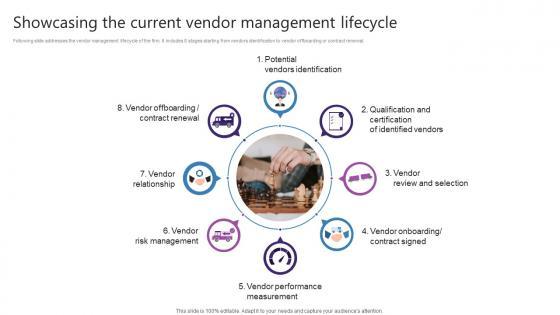 Following slide addresses the vendor management lifecycle of the firm. It includes 8 stages starting from vendors identification to vendor offboarding or contract renewal. Presenting this PowerPoint presentation, titled Showcasing The Current Vendor Management Lifecycle Strategic Plan For Enhancing Background Pdf, with topics curated by our researchers after extensive research. This editable presentation is available for immediate download and provides attractive features when used. Download now and captivate your audience. Presenting this Showcasing The Current Vendor Management Lifecycle Strategic Plan For Enhancing Background Pdf. Our researchers have carefully researched and created these slides with all aspects taken into consideration. This is a completely customizable Showcasing The Current Vendor Management Lifecycle Strategic Plan For Enhancing Background Pdf that is available for immediate downloading. Download now and make an impact on your audience. Highlight the attractive features available with our PPTs. Following slide addresses the vendor management lifecycle of the firm. It includes 8 stages starting from vendors identification to vendor offboarding or contract renewal.