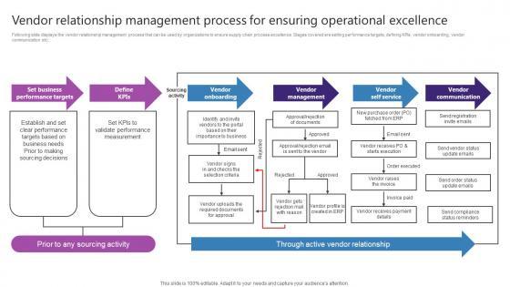 Following slide displays the vendor relationship management process that can be used by organizations to ensure supply chain process excellence. Stages covered are setting performance targets, defining KPIs, vendor onboarding, vendor communication etc. Are you searching for a Vendor Relationship Management Process For Ensuring Strategic Plan For Enhancing Clipart Pdf that is uncluttered, straightforward, and original It is easy to edit, and you can change the colors to suit your personal or business branding. For a presentation that expresses how much effort you have put in, this template is ideal With all of its features, including tables, diagrams, statistics, and lists, it is perfect for a business plan presentation. Make your ideas more appealing with these professional slides. Download Vendor Relationship Management Process For Ensuring Strategic Plan For Enhancing Clipart Pdf from Slidegeeks today. Following slide displays the vendor relationship management process that can be used by organizations to ensure supply chain process excellence. Stages covered are setting performance targets, defining KPIs, vendor onboarding, vendor communication etc.