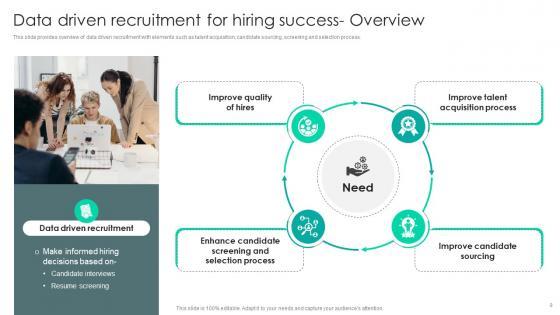 This slide provides overview of data driven recruitment with elements such as talent acquisition, candidate sourcing, screening and selection process. Are you in need of a template that can accommodate all of your creative concepts This one is crafted professionally and can be altered to fit any style. Use it with Google Slides or PowerPoint. Include striking photographs, symbols, depictions, and other visuals. Fill, move around, or remove text boxes as desired. Test out color palettes and font mixtures. Edit and save your work, or work with colleagues. Download Strategic Staffing Using Data Data Driven Recruitment For Hiring Success Overview CRP DK SS V and observe how to make your presentation outstanding. Give an impeccable presentation to your group and make your presentation unforgettable. This slide provides overview of data driven recruitment with elements such as talent acquisition, candidate sourcing, screening and selection process.