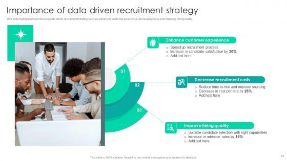 This slide highlights impact of using data driven recruitment strategy such as enhancing customer experience, decreasing costs and improving hiring quality. The Strategic Staffing Using Data Importance Of Data Driven Recruitment Strategy CRP DK SS V is a compilation of the most recent design trends as a series of slides. It is suitable for any subject or industry presentation, containing attractive visuals and photo spots for businesses to clearly express their messages. This template contains a variety of slides for the user to input data, such as structures to contrast two elements, bullet points, and slides for written information. Slidegeeks is prepared to create an impression. This slide highlights impact of using data driven recruitment strategy such as enhancing customer experience, decreasing costs and improving hiring quality.