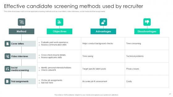 This slide showcases most common applicant screening methods such as cover letters, video interviews, social media and trial assignments. Crafting an eye-catching presentation has never been more straightforward. Let your presentation shine with this tasteful yet straightforward Strategic Staffing Using Data Driven Effective Candidate Screening Methods Used CRP DK SS V template. It offers a minimalistic and classy look that is great for making a statement. The colors have been employed intelligently to add a bit of playfulness while still remaining professional. Construct the ideal Strategic Staffing Using Data Driven Effective Candidate Screening Methods Used CRP DK SS V that effortlessly grabs the attention of your audience Begin now and be certain to wow your customers This slide showcases most common applicant screening methods such as cover letters, video interviews, social media and trial assignments.