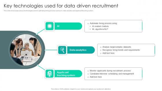 This slide showcases various technologies used in optimizing hiring process such as AI, data analytics and applicant tracking system. Slidegeeks has constructed Strategic Staffing Using Data Key Technologies Used For Data Driven Recruitment CRP DK SS V after conducting extensive research and examination. These presentation templates are constantly being generated and modified based on user preferences and critiques from editors. Here, you will find the most attractive templates for a range of purposes while taking into account ratings and remarks from users regarding the content. This is an excellent jumping-off point to explore our content and will give new users an insight into our top-notch PowerPoint Templates. This slide showcases various technologies used in optimizing hiring process such as AI, data analytics and applicant tracking system.