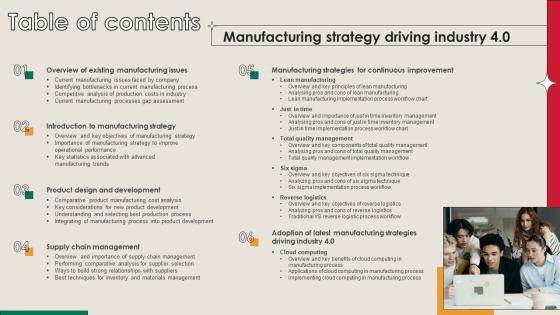 Coming up with a presentation necessitates that the majority of the effort goes into the content and the message you intend to convey. The visuals of a PowerPoint presentation can only be effective if it supplements and supports the story that is being told. Keeping this in mind our experts created Table Of Contents For Manufacturing Strategy Driving Industry 4 0 Ppt Grids to reduce the time that goes into designing the presentation. This way, you can concentrate on the message while our designers take care of providing you with the right template for the situation. Our Table Of Contents For Manufacturing Strategy Driving Industry 4 0 Ppt Grids are topically designed to provide an attractive backdrop to any subject. Use them to look like a presentation pro.
