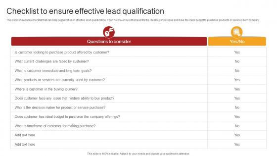 This slide showcases checklist that can help organization in effective lead qualification. It can help to ensure that lead fits the ideal buyer persona and have the ideal budget to purchase products or services from company. From laying roadmaps to briefing everything in detail, our templates are perfect for you. You can set the stage with your presentation slides. All you have to do is download these easy-to-edit and customizable templates. Telesales Strategy For Targeting Checklist To Ensure Effective Lead Qualification Strategy SS V will help you deliver an outstanding performance that everyone would remember and praise you for. Do download this presentation today. This slide showcases checklist that can help organization in effective lead qualification. It can help to ensure that lead fits the ideal buyer persona and have the ideal budget to purchase products or services from company.