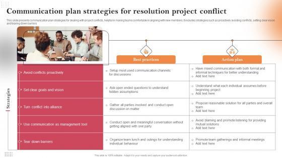 This slide presents communication plan strategies for dealing with project conflicts, helpful in making teams comfortable in aligning with new members. It includes strategies such as proactively avoiding conflicts, setting clear vision and tearing down barriers Showcasing this set of slides titled Communication Plan Strategies For Resolution Project Conflict Introduction Pdf. The topics addressed in these templates are Avoid Conflicts Proactively, Turn Conflict Alliance, Tear Down Barriers. All the content presented in this PPT design is completely editable. Download it and make adjustments in color, background, font etc. as per your unique business setting. This slide presents communication plan strategies for dealing with project conflicts, helpful in making teams comfortable in aligning with new members. It includes strategies such as proactively avoiding conflicts, setting clear vision and tearing down barriers