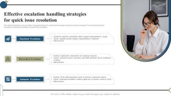 This slide includes the issue escalation management types for customers to manage unresolved customer requests. This includes functional escalation, hierarchical escalation, and automatic escalation. Showcasing this set of slides titled Effective Escalation Handling Strategies For Quick Issue Resolution Pictures Pdf The topics addressed in these templates are Functional Escalations, Hierarchical Escalations, Automatic Escalations All the content presented in this PPT design is completely editable. Download it and make adjustments in color, background, font etc. as per your unique business setting. This slide includes the issue escalation management types for customers to manage unresolved customer requests. This includes functional escalation, hierarchical escalation, and automatic escalation.