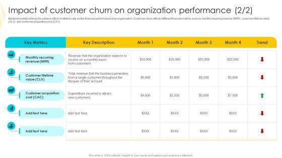 Mentioned slide outlines the impact of a higher attrition rate on the companys financial performance. It contains information about major financial key performance indicators KPIs such as monthly recurring revenue MRR, customer lifetime value CLV, and customer acquisition cost CAC. If you are looking for a format to display your unique thoughts, then the professionally designed Impact Of Customer Churn On Strategies To Mitigate Customer Churn Template Pdf is the one for you. You can use it as a Google Slides template or a PowerPoint template. Incorporate impressive visuals, symbols, images, and other charts. Modify or reorganize the text boxes as you desire. Experiment with shade schemes and font pairings. Alter, share or cooperate with other people on your work. Download Impact Of Customer Churn On Strategies To Mitigate Customer Churn Template Pdf and find out how to give a successful presentation. Present a perfect display to your team and make your presentation unforgettable. Mentioned slide outlines the impact of a higher attrition rate on the companys financial performance. It contains information about major financial key performance indicators KPIs such as monthly recurring revenue MRR, customer lifetime value CLV, and customer acquisition cost CAC.