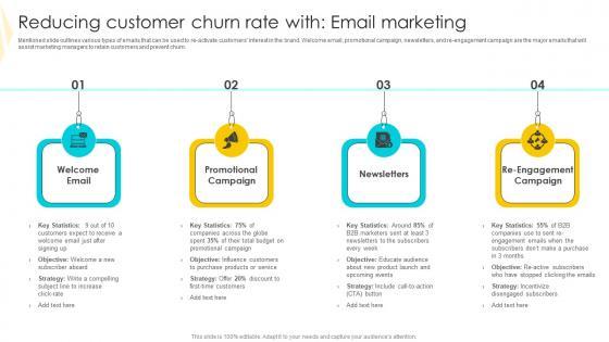 Mentioned slide outlines various types of emails that can be used to re activate customers interest in the brand. Welcome email, promotional campaign, newsletters, and re engagement campaign are the major emails that will assist marketing managers to retain customers and prevent churn. This Reducing Customer Churn Strategies To Mitigate Customer Churn Pictures Pdf from Slidegeeks makes it easy to present information on your topic with precision. It provides customization options, so you can make changes to the colors, design, graphics, or any other component to create a unique layout. It is also available for immediate download, so you can begin using it right away. Slidegeeks has done good research to ensure that you have everything you need to make your presentation stand out. Make a name out there for a brilliant performance. Mentioned slide outlines various types of emails that can be used to re activate customers interest in the brand. Welcome email, promotional campaign, newsletters, and re engagement campaign are the major emails that will assist marketing managers to retain customers and prevent churn.