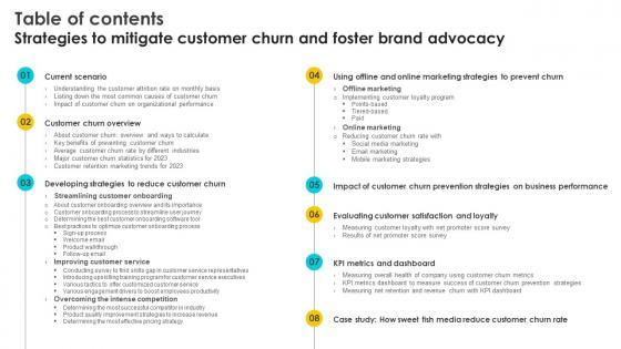 Boost your pitch with our creative Table Of Contents Strategies To Mitigate Customer Churn And Foster Sample Pdf. Deliver an awe inspiring pitch that will mesmerize everyone. Using these presentation templates you will surely catch everyones attention. You can browse the ppts collection on our website. We have researchers who are experts at creating the right content for the templates. So you do not have to invest time in any additional work. Just grab the template now and use them. Our Table Of Contents Strategies To Mitigate Customer Churn And Foster Sample Pdf are topically designed to provide an attractive backdrop to any subject. Use them to look like a presentation pro.