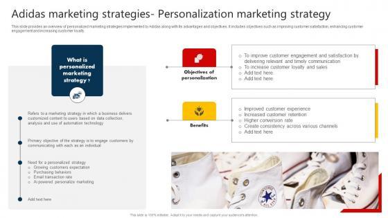 This slide provides an overview of personalized marketing strategies implemented by Adidas along with its advantages and objectives. It includes objectives such as improving customer satisfaction, enhancing customer engagement and increasing customer loyalty. From laying roadmaps to briefing everything in detail, our templates are perfect for you. You can set the stage with your presentation slides. All you have to do is download these easy-to-edit and customizable templates. Adidas Marketing Strategies Personalization Marketing Strategy SS V will help you deliver an outstanding performance that everyone would remember and praise you for. Do download this presentation today. This slide provides an overview of personalized marketing strategies implemented by Adidas along with its advantages and objectives. It includes objectives such as improving customer satisfaction, enhancing customer engagement and increasing customer loyalty.