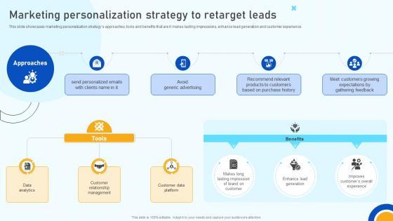 This slide showcases marketing personalization strategys approaches, tools and benefits that are it makes lasting impressions, enhance lead generation and customer experience. The Digital Marketing Strategies Marketing Personalization Strategy To Retarget Leads SA SS V is a compilation of the most recent design trends as a series of slides. It is suitable for any subject or industry presentation, containing attractive visuals and photo spots for businesses to clearly express their messages. This template contains a variety of slides for the user to input data, such as structures to contrast two elements, bullet points, and slides for written information. Slidegeeks is prepared to create an impression. This slide showcases marketing personalization strategys approaches, tools and benefits that are it makes lasting impressions, enhance lead generation and customer experience.