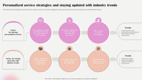 This slide presents strategies for optimizing salon customer services. It includes strategies for offering personalized services and staying up-to-date with industry trends. Make sure to capture your audiences attention in your business displays with our gratis customizable Salon Marketing Plan To Optimize Personalized Service Strategies And Staying Strategy SS V. These are great for business strategies, office conferences, capital raising or task suggestions. If you desire to acquire more customers for your tech business and ensure they stay satisfied, create your own sales presentation with these plain slides. This slide presents strategies for optimizing salon customer services. It includes strategies for offering personalized services and staying up-to-date with industry trends.