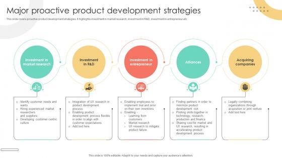 This slide covers proactive product development strategies. It highlights investment in market research, investment in RandD, investment in entrepreneur etc. Welcome to our selection of the Major Proactive Product Development Strategies PPT Template Strategy SS V. These are designed to help you showcase your creativity and bring your sphere to life. Planning and Innovation are essential for any business that is just starting out. This collection contains the designs that you need for your everyday presentations. All of our PowerPoints are 100Percent editable, so you can customize them to suit your needs. This multi-purpose template can be used in various situations. Grab these presentation templates today. This slide covers proactive product development strategies. It highlights investment in market research, investment in RandD, investment in entrepreneur etc.
