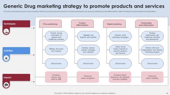 This slide showcases the generic drug marketing method to promote product and services. It includes techniques such as price positioning, product differentiation, digital marketing and partnerships and collaborations. If you are looking for a format to display your unique thoughts, then the professionally designed Generic Drug Marketing Strategy To Promote Accelerating Market Share And Profitability MKT SS V is the one for you. You can use it as a Google Slides template or a PowerPoint template. Incorporate impressive visuals, symbols, images, and other charts. Modify or reorganize the text boxes as you desire. Experiment with shade schemes and font pairings. Alter, share or cooperate with other people on your work. Download Generic Drug Marketing Strategy To Promote Accelerating Market Share And Profitability MKT SS V and find out how to give a successful presentation. Present a perfect display to your team and make your presentation unforgettable. This slide showcases the generic drug marketing method to promote product and services. It includes techniques such as price positioning, product differentiation, digital marketing and partnerships and collaborations.