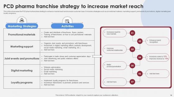 This slide showcases the PCD pharma franchise strategy to enhance market reach and increase customer base. It includes strategies such as promotional material, marketing support, joint events and promotions, digital marketing and loyalty programs. Take your projects to the next level with our ultimate collection of PCD Pharma Franchise Strategy To Accelerating Market Share And Profitability MKT SS V. Slidegeeks has designed a range of layouts that are perfect for representing task or activity duration, keeping track of all your deadlines at a glance. Tailor these designs to your exact needs and give them a truly corporate look with your own brand colors they will make your projects stand out from the rest This slide showcases the PCD pharma franchise strategy to enhance market reach and increase customer base. It includes strategies such as promotional material, marketing support, joint events and promotions, digital marketing and loyalty programs.