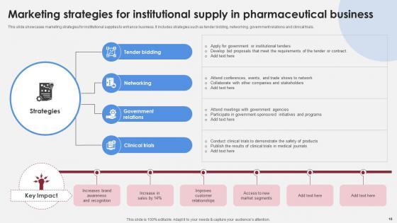 This slide showcases marketing strategies for institutional supplies to enhance business. It includes strategies such as tender bidding, networking, government relations and clinical trials. Retrieve professionally designed Marketing Strategies For Institutional Supply Accelerating Market Share And Profitability MKT SS V to effectively convey your message and captivate your listeners. Save time by selecting pre-made slideshows that are appropriate for various topics, from business to educational purposes. These themes come in many different styles, from creative to corporate, and all of them are easily adjustable and can be edited quickly. Access them as PowerPoint templates or as Google Slides themes. You do not have to go on a hunt for the perfect presentation because Slidegeeks got you covered from everywhere. This slide showcases marketing strategies for institutional supplies to enhance business. It includes strategies such as tender bidding, networking, government relations and clinical trials.