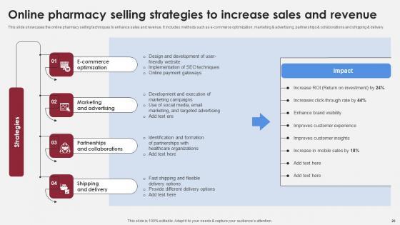 This slide showcases the online pharmacy selling techniques to enhance sales and revenue. It includes methods such as e-commerce optimization, marketing and advertising, partnerships and collaborations and shipping and delivery. Presenting this PowerPoint presentation, titled Online Pharmacy Selling Strategies To Increase Accelerating Market Share And Profitability MKT SS V, with topics curated by our researchers after extensive research. This editable presentation is available for immediate download and provides attractive features when used. Download now and captivate your audience. Presenting this Online Pharmacy Selling Strategies To Increase Accelerating Market Share And Profitability MKT SS V. Our researchers have carefully researched and created these slides with all aspects taken into consideration. This is a completely customizable Online Pharmacy Selling Strategies To Increase Accelerating Market Share And Profitability MKT SS V that is available for immediate downloading. Download now and make an impact on your audience. Highlight the attractive features available with our PPTs. This slide showcases the online pharmacy selling techniques to enhance sales and revenue. It includes methods such as e-commerce optimization, marketing and advertising, partnerships and collaborations and shipping and delivery.