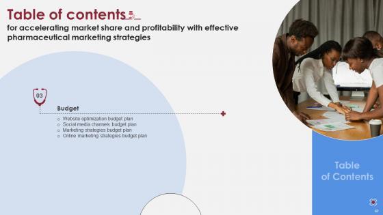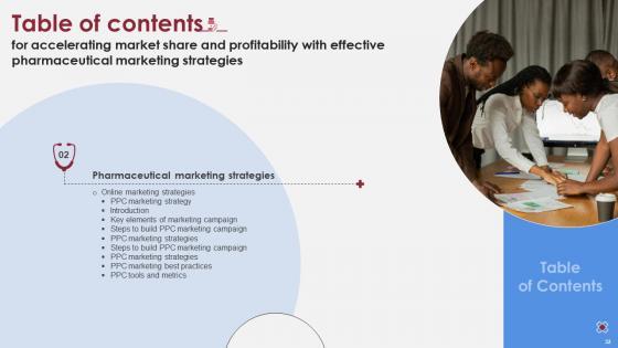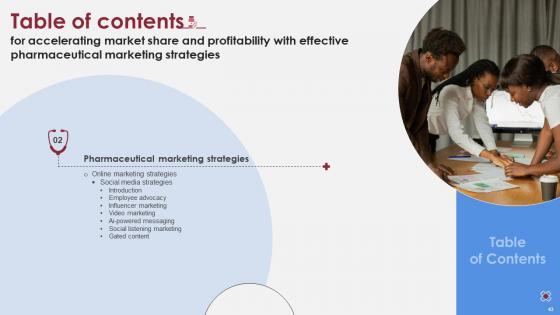 Whether you have daily or monthly meetings, a brilliant presentation is necessary. Table Of Contents Accelerating Market Share And Profitability With Effective Pharmaceutical Marketing Strategies can be your best option for delivering a presentation. Represent everything in detail using Table Of Contents Accelerating Market Share And Profitability With Effective Pharmaceutical Marketing Strategies and make yourself stand out in meetings. The template is versatile and follows a structure that will cater to your requirements. All the templates prepared by Slidegeeks are easy to download and edit. Our research experts have taken care of the corporate themes as well. So, give it a try and see the results. Our Table Of Contents Accelerating Market Share And Profitability With Effective Pharmaceutical Marketing Strategies are topically designed to provide an attractive backdrop to any subject. Use them to look like a presentation pro.