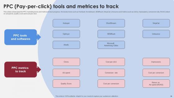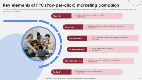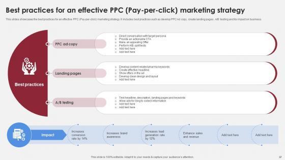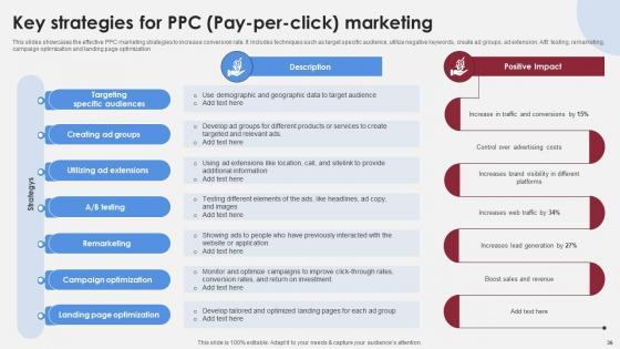 This slides showcases the effective PPC marketing strategies to increase conversion rate. It includes techniques such as target specific audience, utilize negative keywords, create ad groups, ad extension, AB testing, remarketing, campaign optimization and landing page optimization. The Key Strategies For PPC Pay Per Click Marketing Accelerating Market Share And Profitability MKT SS V is a compilation of the most recent design trends as a series of slides. It is suitable for any subject or industry presentation, containing attractive visuals and photo spots for businesses to clearly express their messages. This template contains a variety of slides for the user to input data, such as structures to contrast two elements, bullet points, and slides for written information. Slidegeeks is prepared to create an impression. This slides showcases the effective PPC marketing strategies to increase conversion rate. It includes techniques such as target specific audience, utilize negative keywords, create ad groups, ad extension, AB testing, remarketing, campaign optimization and landing page optimization