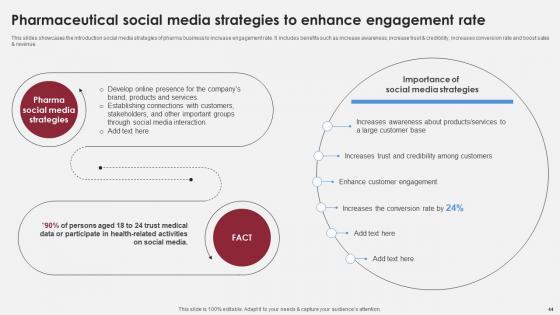 This slides showcases the introduction social media strategies of pharma business to increase engagement rate. It includes benefits such as increase awareness, increase trust and credibility, increases conversion rate and boost sales and revenue. Boost your pitch with our creative Pharmaceutical Social Media Strategies Accelerating Market Share And Profitability MKT SS V. Deliver an awe-inspiring pitch that will mesmerize everyone. Using these presentation templates you will surely catch everyones attention. You can browse the ppts collection on our website. We have researchers who are experts at creating the right content for the templates. So you do not have to invest time in any additional work. Just grab the template now and use them. This slides showcases the introduction social media strategies of pharma business to increase engagement rate. It includes benefits such as increase awareness, increase trust and credibility, increases conversion rate and boost sales and revenue.