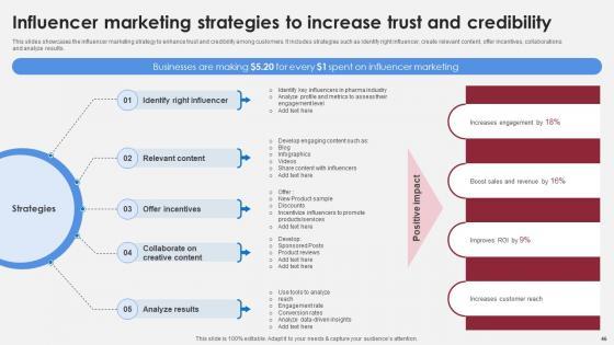 This slides showcases the influencer marketing strategy to enhance trust and credibility among customers. It includes strategies such as identify right influencer, create relevant content, offer incentives, collaborations and analyze results. This Influencer Marketing Strategies To Increase Accelerating Market Share And Profitability MKT SS V is perfect for any presentation, be it in front of clients or colleagues. It is a versatile and stylish solution for organizing your meetings. The Influencer Marketing Strategies To Increase Accelerating Market Share And Profitability MKT SS V features a modern design for your presentation meetings. The adjustable and customizable slides provide unlimited possibilities for acing up your presentation. Slidegeeks has done all the homework before launching the product for you. So, do not wait, grab the presentation templates today This slides showcases the influencer marketing strategy to enhance trust and credibility among customers. It includes strategies such as identify right influencer, create relevant content, offer incentives, collaborations and analyze results.
