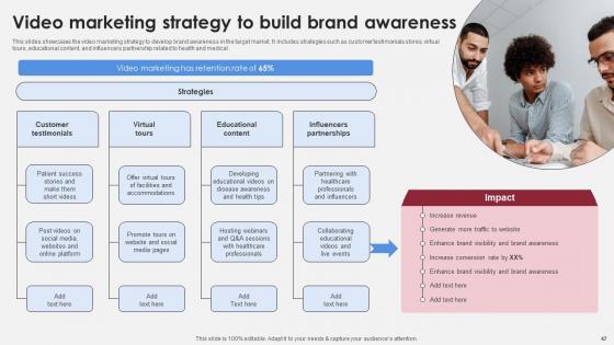 This slides showcases the video marketing strategy to develop brand awareness in the target market. It includes strategies such as customer testimonials stores, virtual tours, educational content, and influencers partnership related to health and medical. If your project calls for a presentation, then Slidegeeks is your go-to partner because we have professionally designed, easy-to-edit templates that are perfect for any presentation. After downloading, you can easily edit Video Marketing Strategy To Build Brand Accelerating Market Share And Profitability MKT SS V and make the changes accordingly. You can rearrange slides or fill them with different images. Check out all the handy templates This slides showcases the video marketing strategy to develop brand awareness in the target market. It includes strategies such as customer testimonials stores, virtual tours, educational content, and influencers partnership related to health and medical.