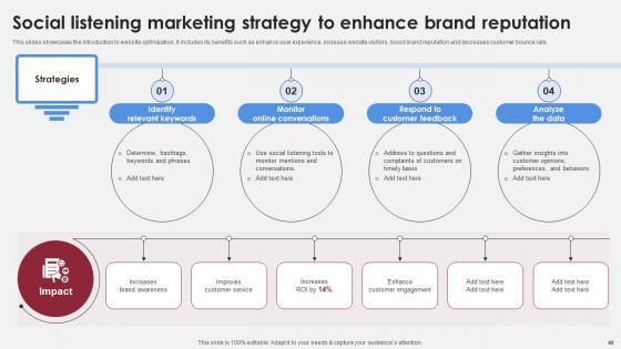 This slides showcases the introduction to website optimization. It includes its benefits such as enhance user experience, increase website visitors, boost brand reputation and decreases customer bounce rate. There are so many reasons you need a Social Listening Marketing Strategy To Accelerating Market Share And Profitability MKT SS V. The first reason is you can not spend time making everything from scratch, Thus, Slidegeeks has made presentation templates for you too. You can easily download these templates from our website easily. This slides showcases the introduction to website optimization. It includes its benefits such as enhance user experience, increase website visitors, boost brand reputation and decreases customer bounce rate.