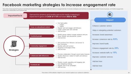 This slides showcases the Facebook marketing techniques to increase brand visibility and improves engagement rate. It includes strategies such as focus on educational content, Facebook groups, community engagement, influencers collaboration and Facebook ads. Find highly impressive Facebook Marketing Strategies To Increase Accelerating Market Share And Profitability MKT SS V on Slidegeeks to deliver a meaningful presentation. You can save an ample amount of time using these presentation templates. No need to worry to prepare everything from scratch because Slidegeeks experts have already done a huge research and work for you. You need to download Facebook Marketing Strategies To Increase Accelerating Market Share And Profitability MKT SS V for your upcoming presentation. All the presentation templates are 100 percent editable and you can change the color and personalize the content accordingly. Download now This slides showcases the Facebook marketing techniques to increase brand visibility and improves engagement rate. It includes strategies such as focus on educational content, Facebook groups, community engagement, influencers collaboration and Facebook ads.